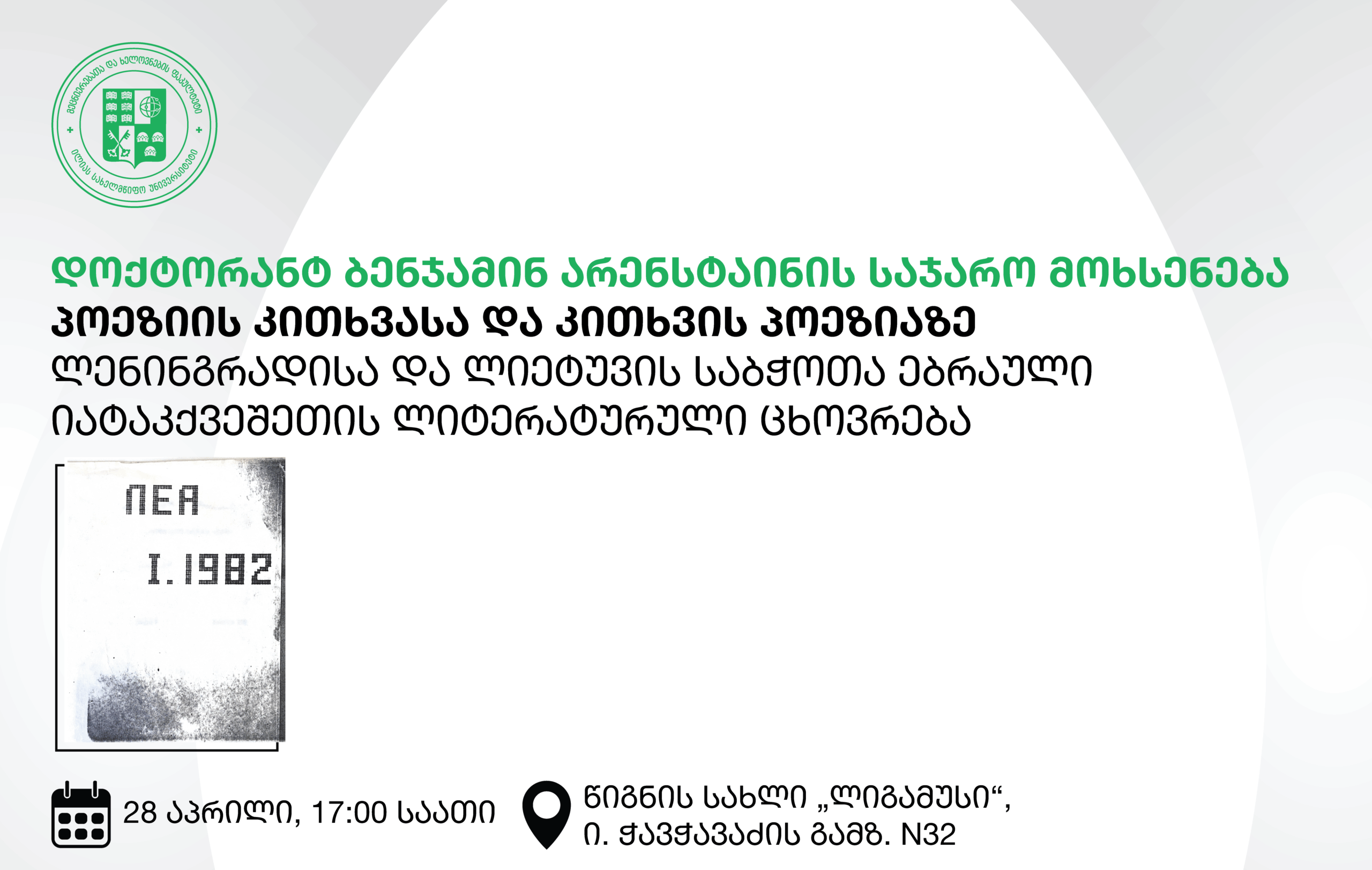 28 აპრილს, 17:00 საათზე, წიგნის სახლში „ლიგამუსი“ ილიას სახელმწიფო უნივერსიტეტის ანთროპოლოგიის კვლევითი ცენტრისა და სოციალური და კულტურული ანთროპოლოგიის სადოქტორო პროგრამის ორგანიზებით ჩიკაგოს უნივერსიტეტის დოქტორანტი ბენჯამინ არენსტაინი წაიკითხავს საჯარო მოხსენებას „პოეზიის კითხვასა და კითხვის პოეზიაზე: ლენინგრადისა და ლიეტუვის საბჭოთა ებრაული იატაკქვეშეთის ლიტერატურული ცხოვრება“.